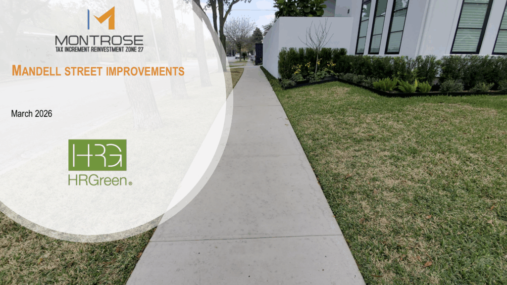 The Montrose Tax Increment Reinvestment Zone (TIRZ 27) invites you to a presentation on the Mandell Street Improvement Project at the beginning of the March TIRZ 27 Board Meeting.